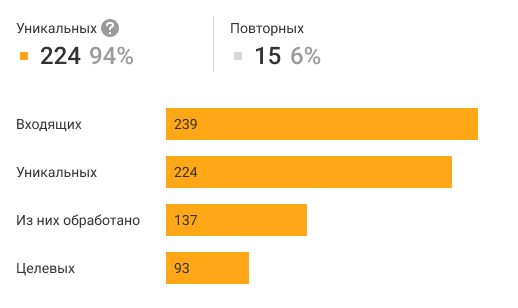 Отчет по количеству показывает не только общее число звонков по каждому каналу, но и то, сколько среди них было уникальных, обработанных, а также целевых вызовов.