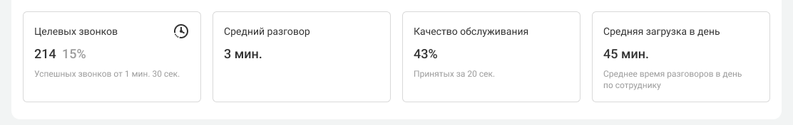 • Целевые звонки — сколько звонков длились не короче и не дольше, чем нужно. Этот показатель можно настроить под себя. Подробнее — в статье про расчет показателей;