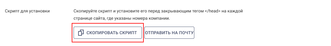 Скопируйте код для подбора номеров и установите его перед закрывающим тегом </head> на каждой странице, где требуется подбор номера. Для этого нажмите на кнопку «Скопировать код». Это поможет своевременно узнавать о возникновении ошибок в работе коллтрекинга.
